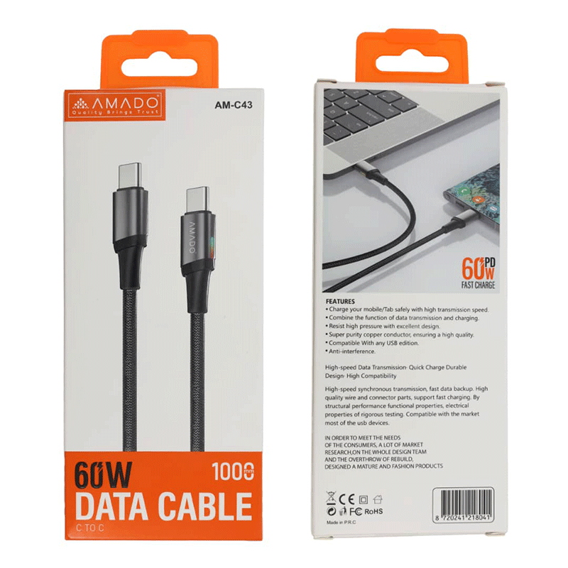 کابل شارژ دو سر Type-C آمادو مدل AM-C43، کابلی با پشتیبانی از Power Delivery تا 60 وات است که برای شارژ سریع گوشیها، تبلتها، پاوربانکها و حتی بسیاری از لپتاپهای سبک مناسب است. این کابل با دو سر Type-C طراحی شده تا اتصال مطمئن و بدون نیاز به تبدیل فراهم کند.