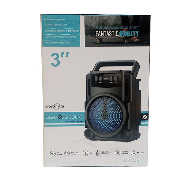 این مدل به باتری قابل شارژ مجهز شده و از روشهای مختلف پخش موسیقی از جمله اتصال بلوتوث، فلش USB و کارت حافظه Micro SD پشتیبانی میکند. همچنین وجود رادیو FM امکان گوش دادن به ایستگاههای رادیویی را فراهم کرده است. طراحی قابل حمل و بدنه مقاوم، استفاده از اسپیکر GTS-1360 را در موقعیتهای مختلف آسان میکند.